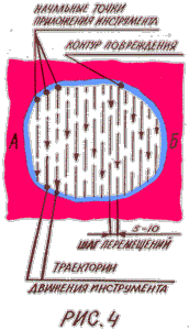 После первого прохода от края А до края Б (см. рис. 4) следует осмотреть результаты работы, осмотр производить с выбранной точки (см. рис. 2). Очень возможно, что размер повреждения уже уменьшился и следует изменить координаты приложения инструмента при последующем проходе. При незначительных изменениях повреждения или при полном отсутствии изменений следует усилить прижатие инструмента. Можно также уменьшить радиусы заточки рабочего конца скалки. При этом не следует забывать, что слишком острый конец или чрезмерное усилие прижатия инструмента к поверхности приведут к появлению "грядок" на лицевой поверхности металла. При работе необходимо чаще осматривать обрабатываемую поверхность снаружи, чтобы своевременно корректировать границы повреждения и не переусердствовать. Количество проходов до полного исправления повреждения зависит от многих факторов: качества и толщины кузовного металла, прилагаемого усилия, площади и глубины вмятины, навыков в работе.